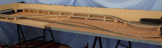 The track plan has been decided and has evolved from the initial simple dual loops. It now consists of a rear fiddle yard with a mainly single track looping around the scenic section twice over two levels (see diagram below). The basic trackbed for the levels has been completed ready for track laying.