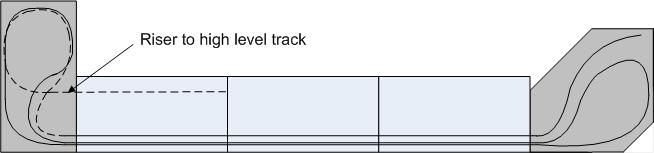 The above shows a typical single module build to the N Mod dimensions. Modules built to these standards can then be combined to build larger layouts. Modular layouts are normally constructed as a square / rectangle with corner boards linking the sides. We quickly recognised that the number of modules required to build such a layout was beyond our immediate scope and decided that we would need an alternative method of constructing a layout with small numbers of modules. This requirement along with a variation suggested by some members to include a high level line in addition to the standard three through lines, led to us developing our own return boards with simple loops. This allows an additional running options when the groups modules are displayed together, but does not prevent them being used with standard N mod modules. In the diagram below the left hand board has a simple loop to return the main running lines and a rising track lifting the third line to link with the high level line. The right hand return has again a simple loop to return the main running lines and this time a dead end for the third line. To prevent accidents this has a diode section, stopping engines running over the end of the board, but able to return when the controller is reversed.