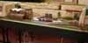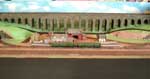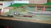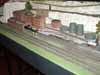 One aspect of running the modules in a rectangular form is the difficulty with access to the operating well. With boards 2'6" deep this is not easy for some members. To ease this and help speed up the setup time a pair of modules only 8" wide have been made. These are simple through tracks in an urban scenic with a retaining wall along the entire length. The backscene has has layered town images to give some slight relief / impression of depth. The boards hinge for transport and a drop in road bridge disguises the join.