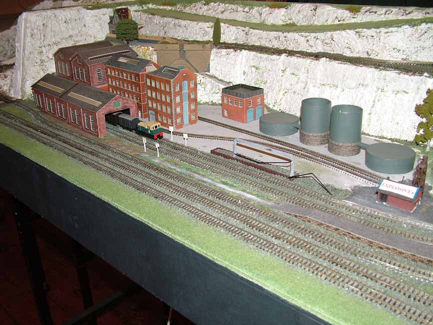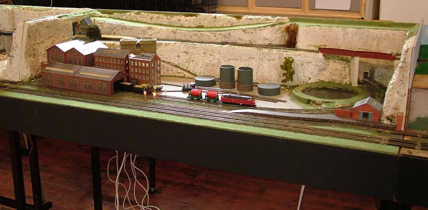 This module was originally started by the late Cyril Powell. Cyril had always intended to produce an urban / industrial scene and had assembled a number of building kits. Follwing his death members agreed that the module should be completed as per Cyrils intention, hence Trevor has since done this. A connection from the third rail allows access to an industrial complex. Points within this are 'wire in tube' operated, with remote uncoupling using Peco lift arms / electromagnets. There is a small fiddle yard at the rear. On the upper level there is a scene with terraced housing and a small station with bay. This can be used a terminus for the high level track or offer through running. A recent addition are controls to operate trains on the upper level including an automatic shuttle. Buildings are mainly from Metcalf card kits with retaining walls and roads from Scalescenes sheets.