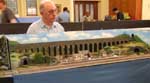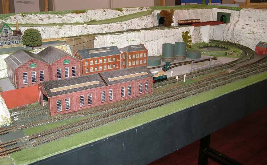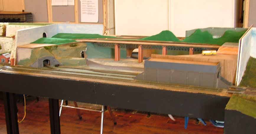 One of the first modules under construction was by Bob. Construction of most modules have a common format with plywood framing with solid top for the trackbed and bolt on metal tube legs. Bob, built an industrial scene with its own internal railway moving loaded and empty wagons around the site. Using his electronics skills Bob has made this fully automated, including a shuttle linking the high level lines to the third main running line. Some of us initially thought this was a bit of a gimmick, but having seen Bob wandering around the show and drinking tea, whilst people watch the module in action, this does have its merits. Bob also constructed one of the return modules, scenically matched to his module, which forms a simple loop return for the main two running lines and a riser lifting the third line to the high level line.