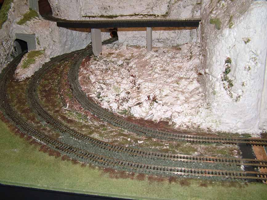 With his interest in the Western region Trevor has build a set of modules based on the Dawlish coast area that can either form a straight pair or a corner set. The modules are all straight through roads but have some increased separation for tunnels. The front of the modules drops down below track level and extent forward by 6" to allow the sea and beach to be modelled. At the rear the land rises to model the cliffs. Also modelled are a couple of tunnels (split 2 road and 1 road).