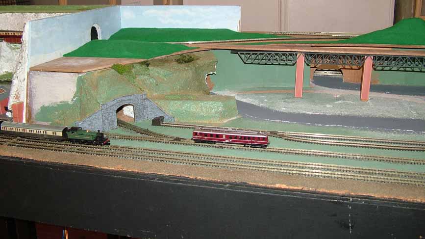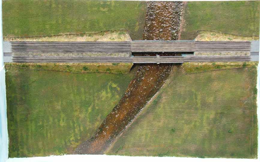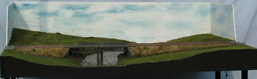 A third module has subsequently been completed by Trevor. This is a straightforward scenic module with the three tracks passing over a river crossing. The construction of the module varies from the others as it is an open frame construction to allow building below the trackbed level. The module takes advantage of an option in the N-Mod specification to allow an additional 6" of scenic space in front of the trackwork.