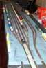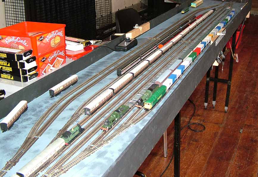 To complete a running layout the Chris has constructed a fiddle yard for stock storage. This is effectively a double length module which normally is configured for through running, but they can also be used as two separate yards for end to end running. The yard provides 4 roads for each main line and 2 for the third line. The control and power feeds to the main lines are also done on these modules. The control / power for the third line is normally run from Bobs module which has a shuttle control via the high level line.
