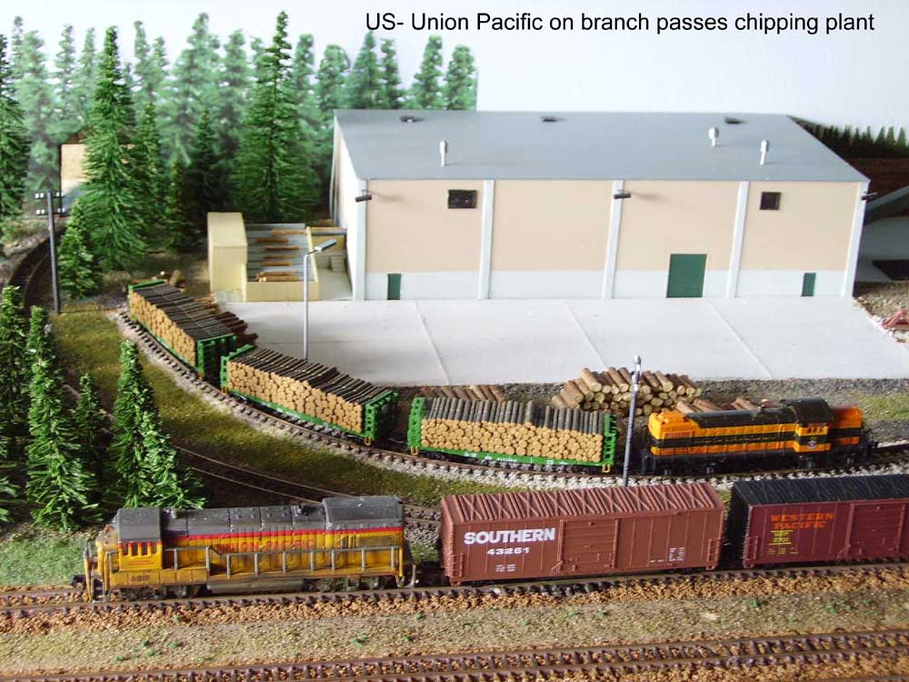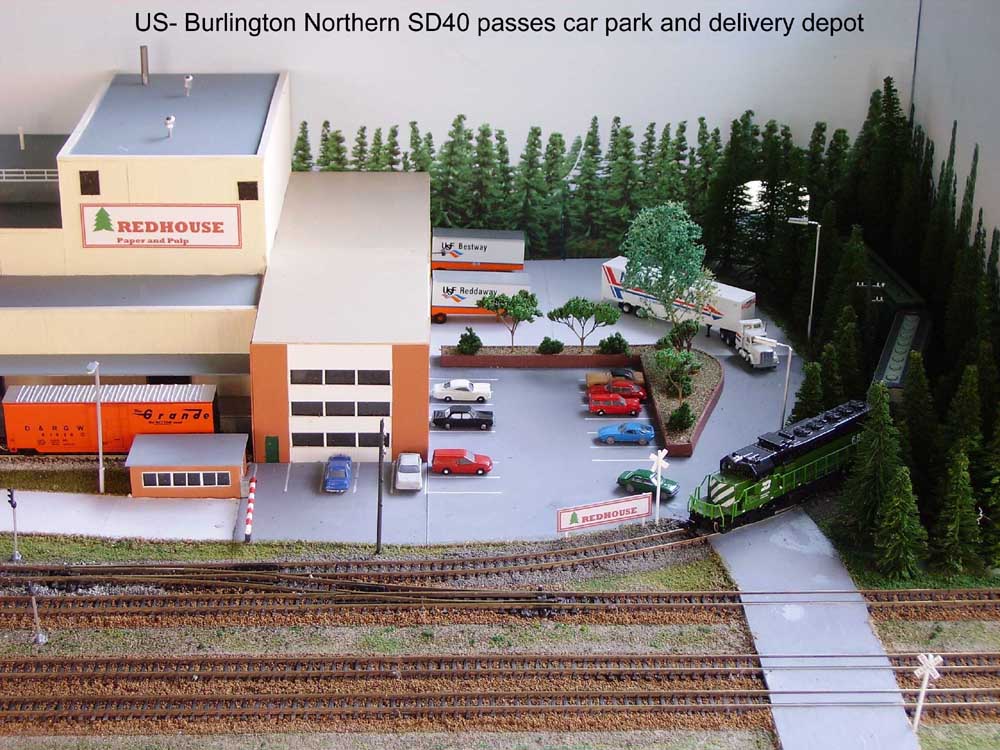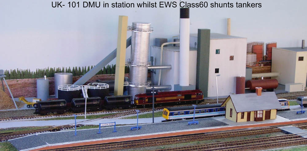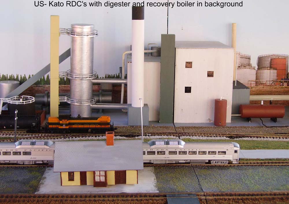 Graham is the first member to construct a pair of linked modules. These are around the theme of a rail served industrial site. Graham has interests in both American and British modelling (you may have seen exhibition layouts and journal articles Graham has produced) and after researching options Graham decided to build a Paper Mill. This is built in the modern era with buildings of a common style currently found in many locations around the world. With some changes to detailing features (vehicles, signs etc) and and interchangeable halt / station, it is possible to run the layout with American / British (or even continental) stock. The plant has all the elements to complete all the processing to turn trees into paper (chipping mill, chip car rotary unloader, digester, recover boiler and mill itself). The buildings and plant equipment are all scratch built from a range of plastic and cardboard parts. The modules incorporate a fiddle yard at the rear, which effectively allow the modules to be operated as a small layout in its own right.