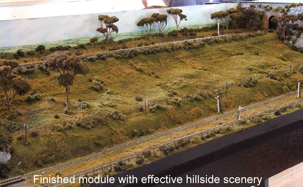 Like Trevor, John has build a scenic module with the the lines running straight through. However he has included the high level line running on an embankment.