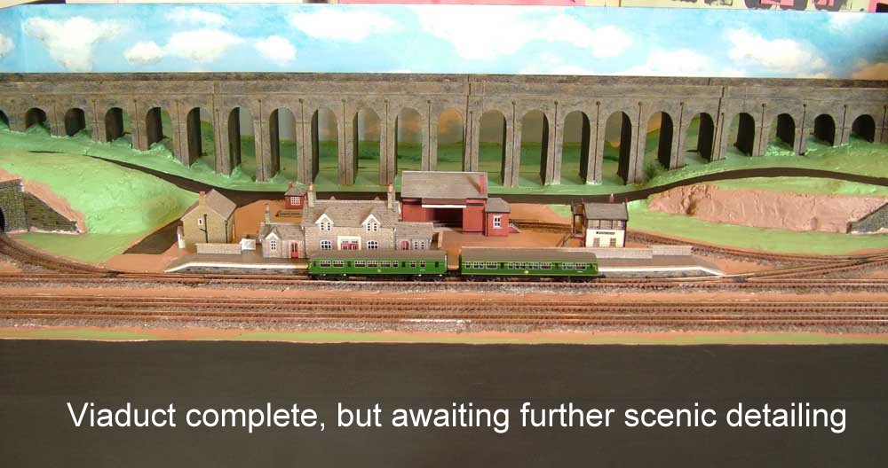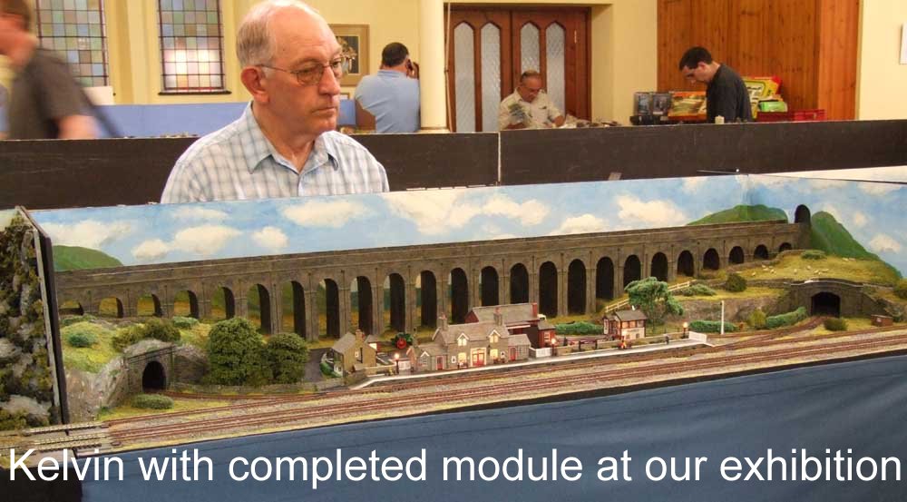 Kelvin has build a module with a small country station connecting to the third line with a very impressive scratchbuilt viaduct carrying the high level line. This is built to the style of the Settle and Carlisle line line with stone being the dominant building material. This module has a loop / fiddle yard at the back which allows some local running.