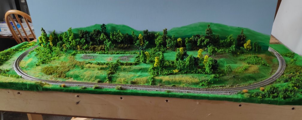 You may all recall that I used an old redundant board, with an oval of Kato track as a running-in loop, and commented that at some point I would scenic it a bit. Well, that point has come.