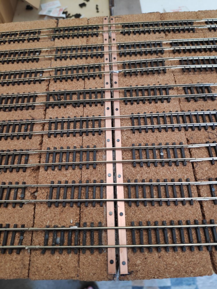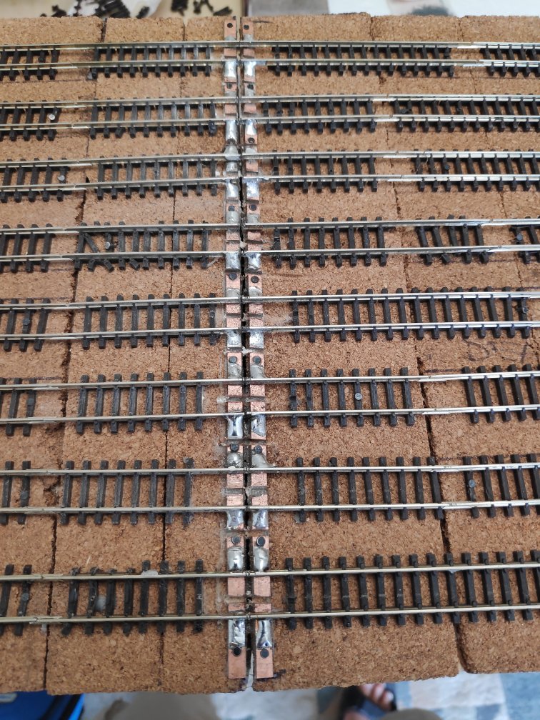 I initially used my old tried and trusted method for board crossing joins – brass screws right at the edges, with the rails soldered to them. This has always served me well. I used a Dremel to cut the rails, but due to the fat body of the tool, I couldn’t get the cutting disc at ninety degrees to the rail and this resulted in diagonal cuts. Unfortunately, this meant that it was getting damaged too often when a moved the boards around, as the sharp rails kept getting caught in my carpet. Chris eventually persuaded me to try his method, which is using strips of PCB with the rails soldered to it. I tried it first where I have just two rails crossing. It went okay, but was quite tricky, I had a lot of trouble getting the solder to take.
