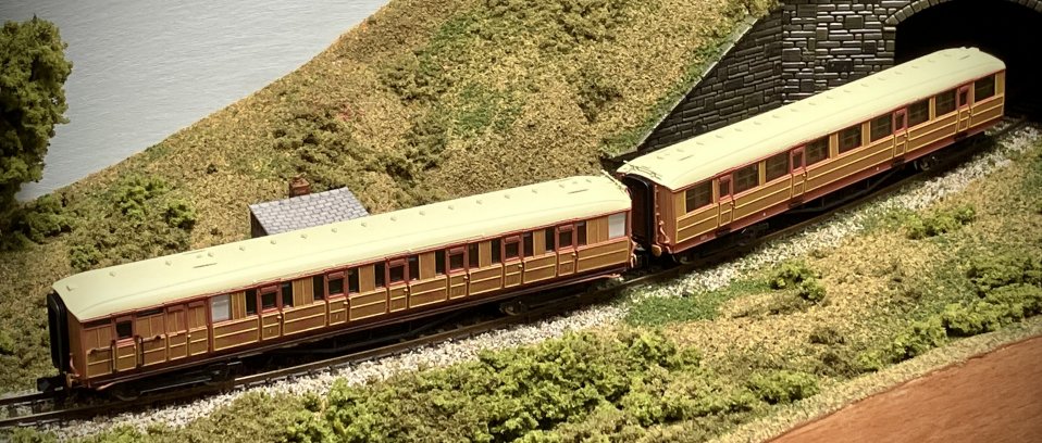 I've just received a rake of Dapol Gresley carriages from Hatton’s, here's a couple of them - those white roofs will need to be weathered down!