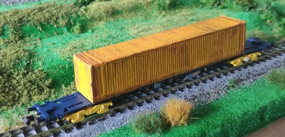 I have painted up a spare container into NR yellow, or as close as I could get it, and weathered it. Putting everything together, it makes a rather nice NR train. Rather annoyingly, I tried to run the container flat behind the generator and it constantly derailed with locked buffers, but it’s okay at the rear. I may add an auto-ballaster, if I can find one for less than the sixty quid that Rails want for one!