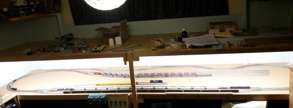 The lights are four foot long LED tube lights, one in each half of the layout, and mounted in the frame nearest the front so that even the front lines are lit without blinding the operator.